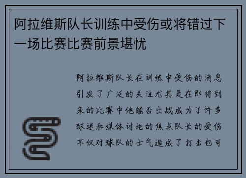 阿拉维斯队长训练中受伤或将错过下一场比赛比赛前景堪忧