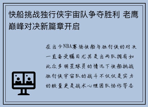 快船挑战独行侠宇宙队争夺胜利 老鹰巅峰对决新篇章开启