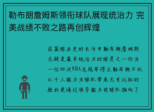 勒布朗詹姆斯领衔球队展现统治力 完美战绩不败之路再创辉煌