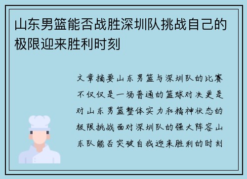 文章摘要:山东男篮与深圳队的比赛,不仅仅是一场普通的篮球对决,更是对山东男篮整体实力和精神状态的极限挑战。面对深圳队的强大阵容,山东队能否突破自我,迎来胜利的时刻,将成为这场比赛的核心话题。从球队的整体实力、关键球员的表现、战术调整、到心理...