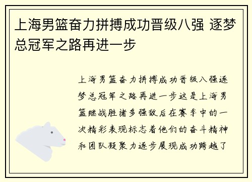 上海男篮奋力拼搏成功晋级八强,逐梦总冠军之路再进一步。这是上海男篮继战胜诸多强敌后,在赛季中的一次精彩表现,标志着他们的奋斗精神和团队凝聚力逐步展现,成功跨越了一道重要的门槛。本文将从上海男篮的赛季表现、关键球员的贡献、战术体系的优化、以及...