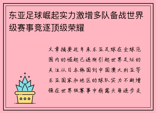 东亚足球崛起实力激增多队备战世界级赛事竞逐顶级荣耀