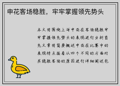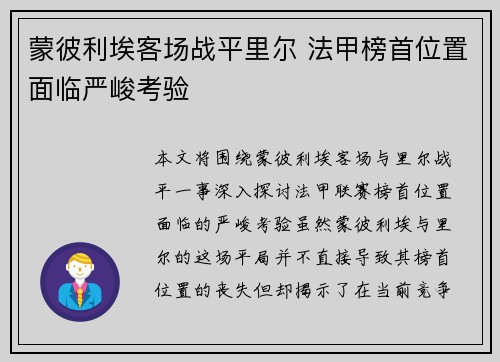 本文将围绕蒙彼利埃客场与里尔战平一事,深入探讨法甲联赛榜首位置面临的严峻考验。虽然蒙彼利埃与里尔的这场平局并不直接导致其榜首位置的丧失,但却揭示了在当前竞争激烈的法甲联赛中,球队能否稳固其领先地位面临的诸多挑战。文章将从四个方面进行详细分析...