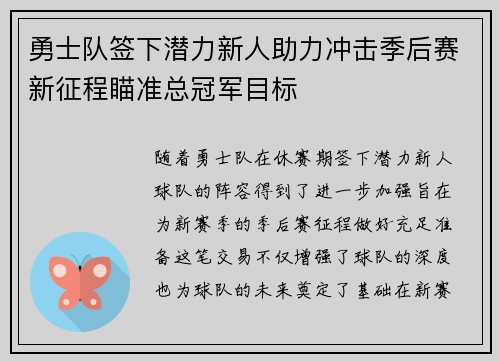 勇士队签下潜力新人助力冲击季后赛新征程瞄准总冠军目标