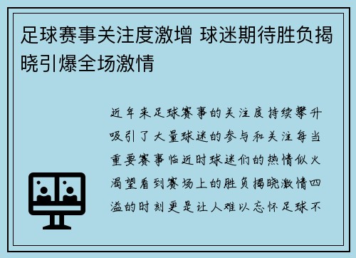 足球赛事关注度激增 球迷期待胜负揭晓引爆全场激情