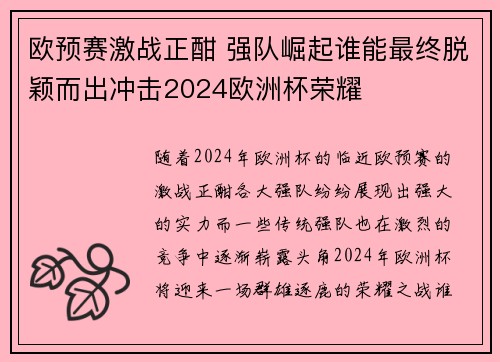 随着2024年欧洲杯的临近,欧预赛的激战正酣。各大强队纷纷展现出强大的实力,而一些传统强队也在激烈的竞争中逐渐崭露头角。2024年欧洲杯将迎来一场群雄逐鹿的荣耀之战,谁能最终脱颖而出,捧起冠军奖杯,成为新一届的欧洲之王?本文将从四个方面深入...