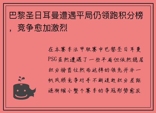 巴黎圣日耳曼遭遇平局仍领跑积分榜,竞争愈加激烈