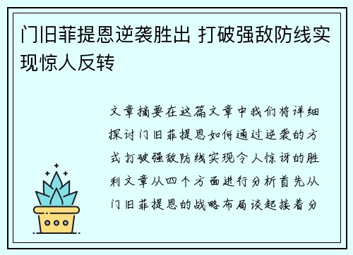 门旧菲提恩逆袭胜出 打破强敌防线实现惊人反转