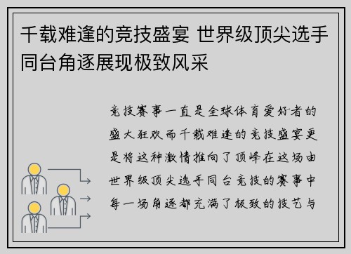 千载难逢的竞技盛宴 世界级顶尖选手同台角逐展现极致风采