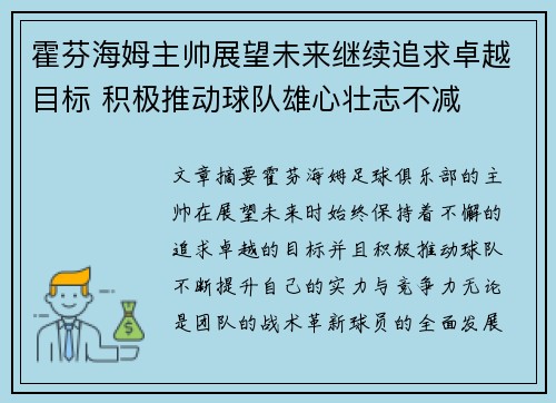 霍芬海姆主帅展望未来继续追求卓越目标 积极推动球队雄心壮志不减