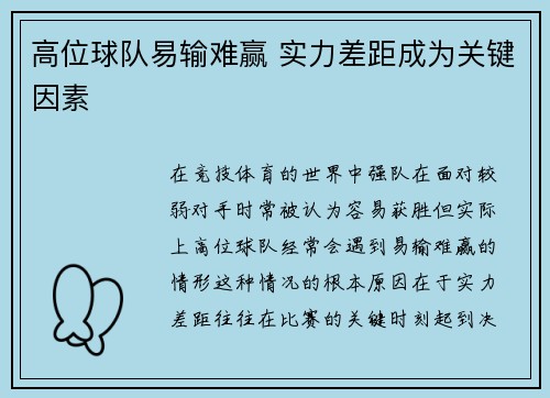 在竞技体育的世界中,强队在面对较弱对手时常被认为容易获胜,但实际上,高位球队经常会遇到“易输难赢”的情形。这种情况的根本原因在于实力差距往往在比赛的关键时刻起到决定性作用。强队本应拥有更多的优势,但在某些情况下,诸多外部和内部因素使得强队也...
