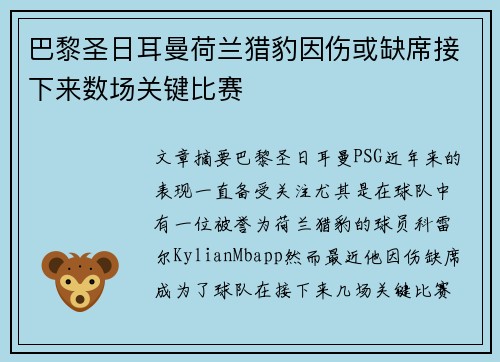 巴黎圣日耳曼荷兰猎豹因伤或缺席接下来数场关键比赛
