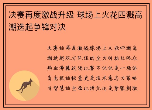 决赛再度激战升级 球场上火花四溅高潮迭起争锋对决
