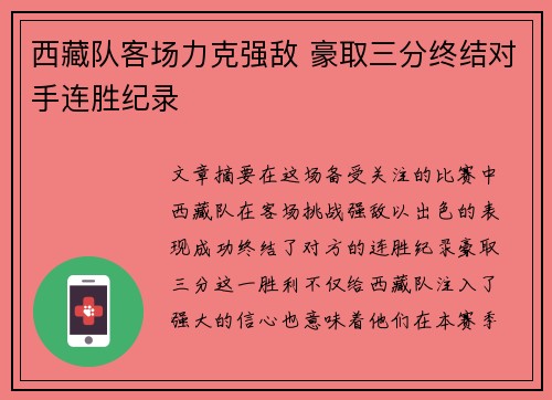 西藏队客场力克强敌 豪取三分终结对手连胜纪录