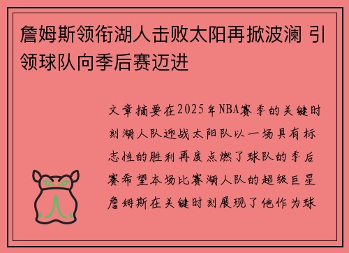 詹姆斯领衔湖人击败太阳再掀波澜 引领球队向季后赛迈进