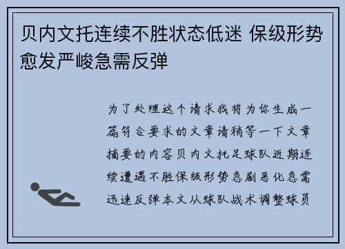 贝内文托连续不胜状态低迷 保级形势愈发严峻急需反弹