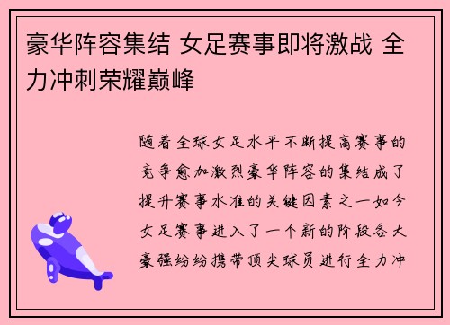 豪华阵容集结 女足赛事即将激战 全力冲刺荣耀巅峰