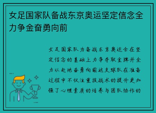 女足国家队为备战东京奥运会,在坚定信念的基础上,力争夺取金牌,并全力以赴地奋勇向前。这支球队在准备过程中,不仅注重技战术的提升,更加强了心理素质的培养与团队协作的训练。在充满挑战的赛程中,女足队员们展现出了不屈不挠的拼搏精神和顽强的竞技风格...