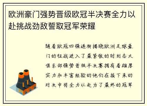 欧洲豪门强势晋级欧冠半决赛全力以赴挑战劲敌誓取冠军荣耀
