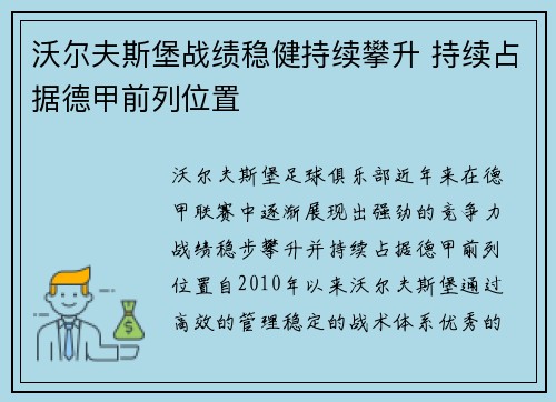 沃尔夫斯堡战绩稳健持续攀升 持续占据德甲前列位置