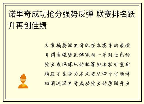 文章摘要:诺里奇队在本赛季的表现可谓是强势反弹,凭借一系列出色的抢分表现,球队的联赛排名跃升,重新焕发了竞争力。本文将从四个方面详细阐述诺里奇成功抢分的原因,并分析其强势反弹的背后因素。首先,诺里奇的战术调整和球队凝聚力成为他们反弹的基石;...