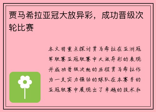 本文将重点探讨贾马希拉在亚洲冠军联赛(亚冠联赛)中大放异彩的表现,并成功晋级次轮的历程。贾马希拉作为一支实力强劲的球队,在本赛季的亚冠联赛中展现出了卓越的技术和战术水平,成功突破了小组赛的重重挑战,赢得了晋级的机会。本文将从四个方面详细分析...