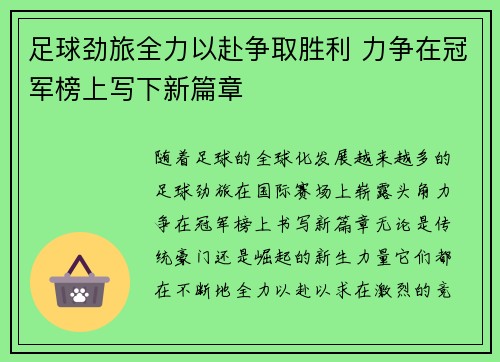 随着足球的全球化发展,越来越多的足球劲旅在国际赛场上崭露头角,力争在冠军榜上书写新篇章。无论是传统豪门,还是崛起的新生力量,它们都在不断地全力以赴,以求在激烈的竞争中脱颖而出。本文将从四个方面对足球劲旅如何全力以赴争取胜利,力争在冠军榜上书...