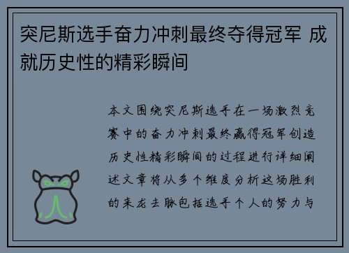 突尼斯选手奋力冲刺最终夺得冠军 成就历史性的精彩瞬间