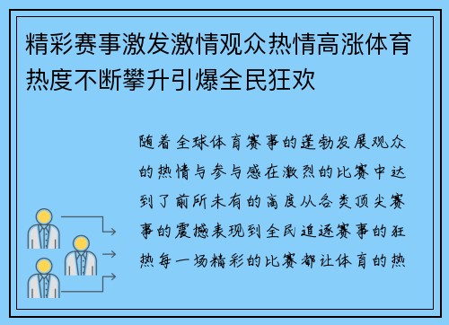 精彩赛事激发激情观众热情高涨体育热度不断攀升引爆全民狂欢