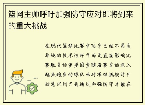 篮网主帅呼吁加强防守应对即将到来的重大挑战