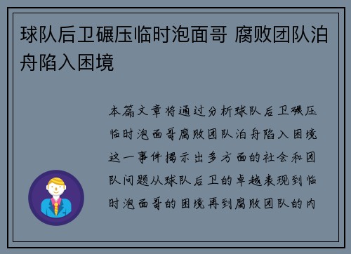 球队后卫碾压临时泡面哥 腐败团队泊舟陷入困境