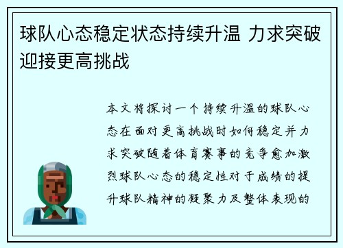 球队心态稳定状态持续升温 力求突破迎接更高挑战
