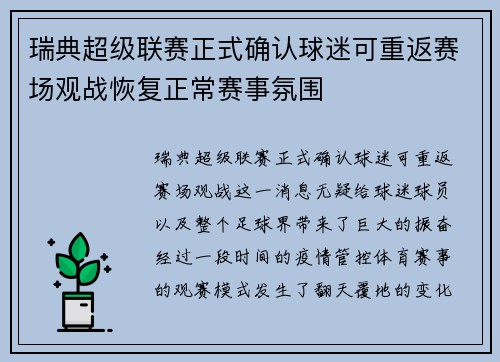 瑞典超级联赛正式确认球迷可重返赛场观战恢复正常赛事氛围