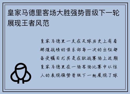 皇家马德里客场大胜强势晋级下一轮展现王者风范