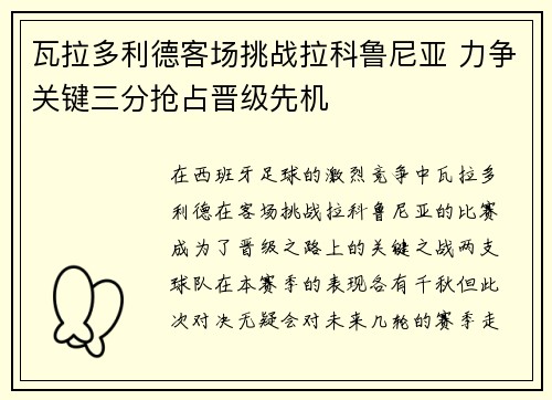 在西班牙足球的激烈竞争中,瓦拉多利德在客场挑战拉科鲁尼亚的比赛成为了晋级之路上的关键之战。两支球队在本赛季的表现各有千秋,但此次对决无疑会对未来几轮的赛季走向产生重大影响。瓦拉多利德作为挑战者,将竭尽全力争取这三分,以确保能够在积分榜上占据...