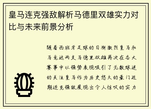 皇马连克强敌解析马德里双雄实力对比与未来前景分析