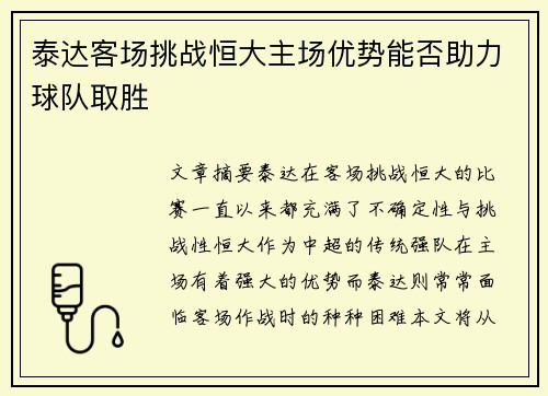 泰达客场挑战恒大主场优势能否助力球队取胜