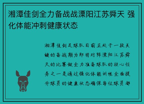 湘潭佳剑足球队目前正处于一段关键的备战期,为即将对阵溧阳江苏舜天的比赛做全力准备。球队的核心任务之一是通过强化体能训练,全面提升球员的健康状态,确保每位球员都能在比赛中展现出最佳的竞技水平。本篇文章将从四个方面对湘潭佳剑全力备战的策略进行详...