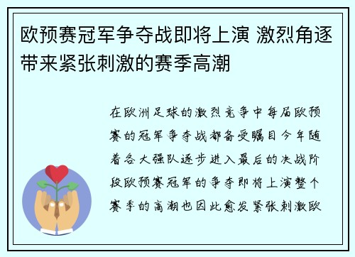 欧预赛冠军争夺战即将上演 激烈角逐带来紧张刺激的赛季高潮