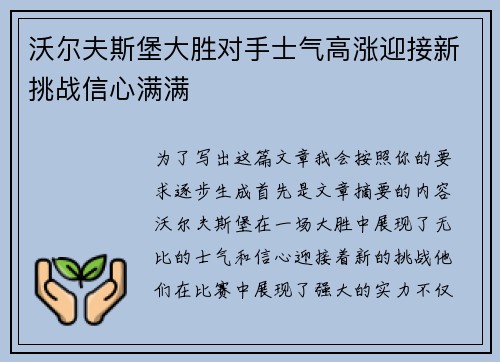 为了写出这篇文章,我会按照你的要求逐步生成。首先是文章摘要的内容:沃尔夫斯堡在一场大胜中展现了无比的士气和信心,迎接着新的挑战。他们在比赛中展现了强大的实力,不仅赢得了胜利,更是以高涨的士气和信心迎接着未来的比赛。乐...
