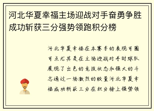 河北华夏幸福主场迎战对手奋勇争胜成功斩获三分强势领跑积分榜