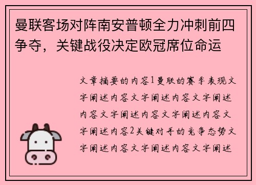 曼联客场对阵南安普顿全力冲刺前四争夺,关键战役决定欧冠席位命运