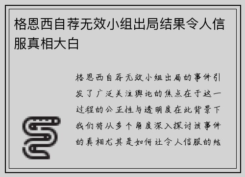 格恩西自荐无效小组出局的事件引发了广泛关注,舆论的焦点在于这一过程的公正性与透明度。在此背景下,我们将从多个角度深入探讨该事件的真相,尤其是如何让“令人信服”的结果最终揭示了整个事件的内在逻辑。本篇文章将从格恩西自荐无效的背景、决策过程的分...