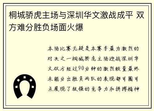 桐城骄虎主场与深圳华文激战成平 双方难分胜负场面火爆