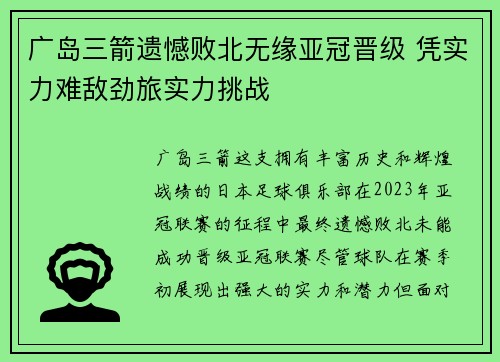 广岛三箭遗憾败北无缘亚冠晋级 凭实力难敌劲旅实力挑战
