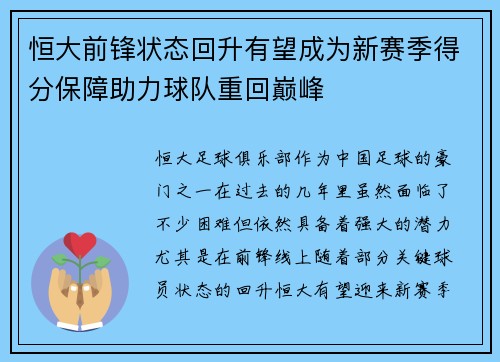 恒大前锋状态回升有望成为新赛季得分保障助力球队重回巅峰