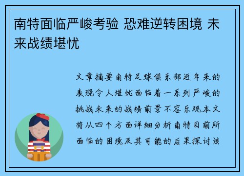 南特面临严峻考验 恐难逆转困境 未来战绩堪忧