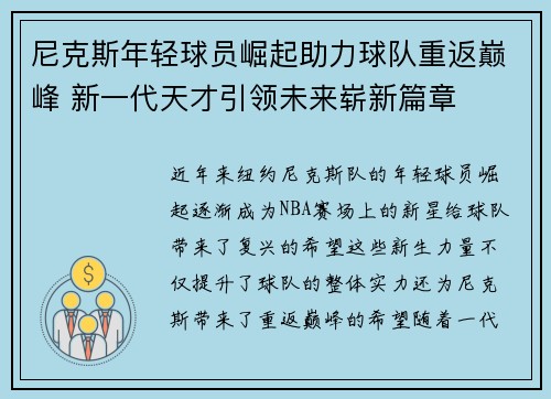 尼克斯年轻球员崛起助力球队重返巅峰 新一代天才引领未来崭新篇章