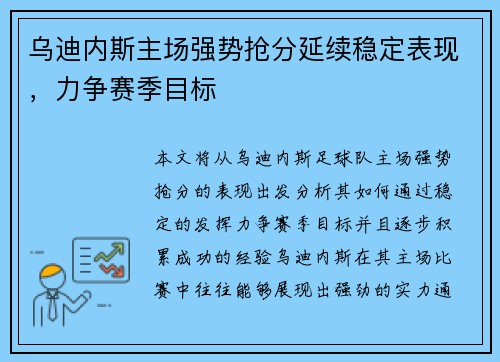 乌迪内斯主场强势抢分延续稳定表现,力争赛季目标