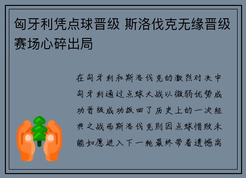 匈牙利凭点球晋级 斯洛伐克无缘晋级赛场心碎出局